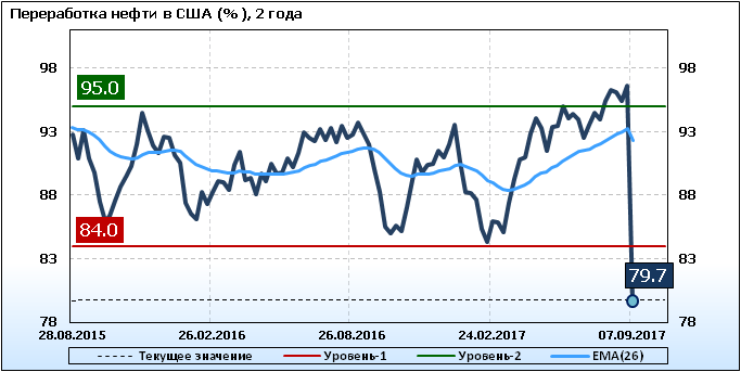 Добыча нефти упала на -0.749 до 8.781 млн. баррелей в день. Импорт нефти упал на -0.822 до 7.083 млн. баррелей в день. Экспорт нефти упал на -0.749 до 0.153 млн. баррелей в день. Таким образом, чистый импорт нефти упал на -0.073 до 6.93 млн. баррелей в день. Переработка нефти упала на -16.9 до 79.7 процентов.