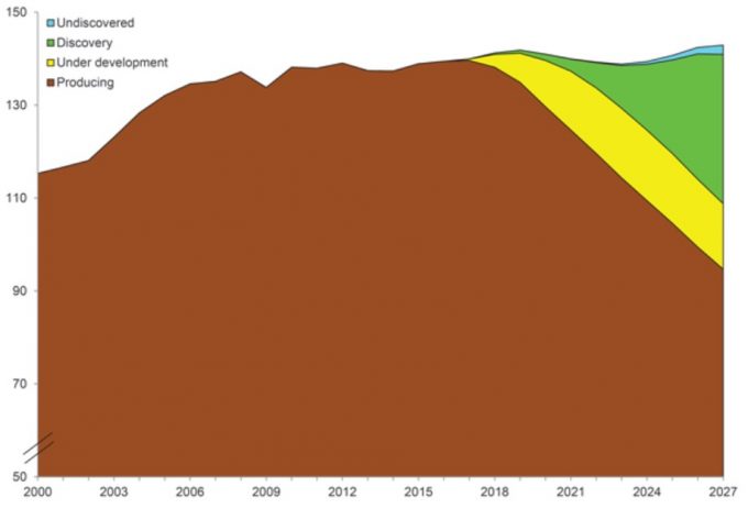К 2027 году показатель добычи на разведанных месторождениях может достичь 32 миллионов boe/d, что составит около 22% от общего мирового показателя предложения. Лишь для половины от этих потенциальных запасов цена безубыточности составляет менее 55 USD/boe. Это означает, что для успешной разработки недавно открытых месторождений необходимо, чтобы цена на нефть повысилась.