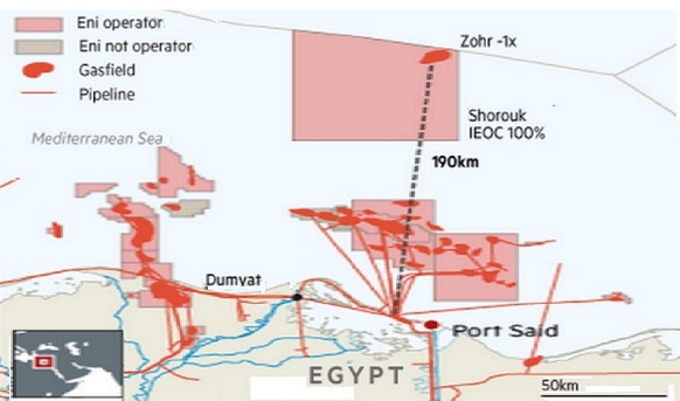 Eni открыла Гигантское месторождение газа на лицензионном участке недр Zohr на блока Шорук (Shorouk) глубоководного шельфа Египта в Средиземном море Eni открыла летом 2015 г.
