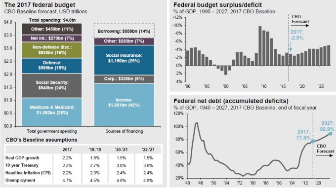 Хотя аналитики предполагают, что существенных изменений тарифов и миграционных показателей в США не произойдет, значительное увеличение расходов на оборону и развитие инфраструктуры, а также сокращение частных и корпоративных налогов могут увеличить дефицит бюджета в 2017 и в 2018 годах.