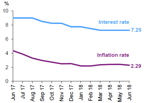 Инфляция в апреле составила 2.41%, в мае — 2.42%, в марте — 2.36%. Базовая семидневная ставка рефинансирования в июне осталась на уровне 7.25%.