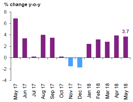 В мае уровень промышленного производства превысил прошлогодний показатель на 3.7%, а в апреле — на 3.9%.