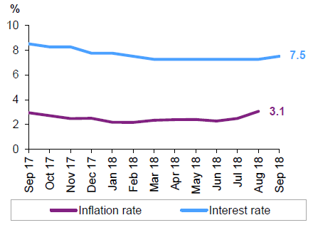 В ответ на обесценивание рубля и рост инфляции, центральный банк увеличил недельную ставку репо в сентябре на 25 базисных пунктов до 7.50%. Ставка выросла впервые с ноября 2014 года.