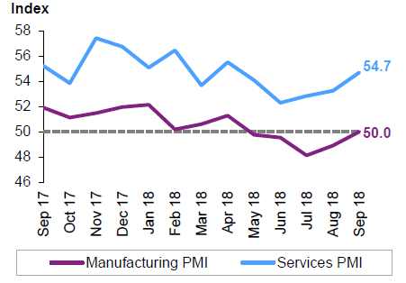 В сентябре четырехмесячное сокращение показателей в производственном секторе прекратилось. Индекс IHS Markit Manufacturing PMI составил 50.0. Для сравнения — в августе данный показатель составил 48.9.