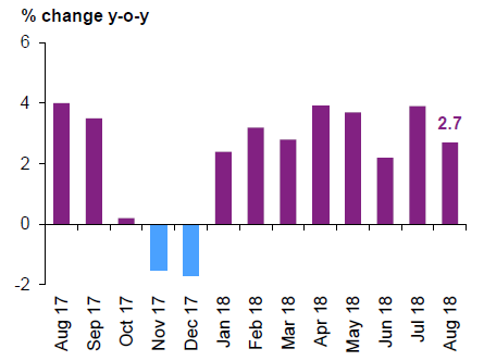Рост объемов промышленного производства в августе составил 2.7%, а в июле — 3.9%.