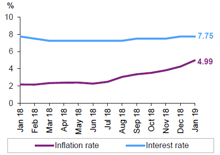 В августе инфляция впервые за 12 месяцев превысила показатель 3%. В связи с этим, Центральный Банк в декабре увеличил недельную ставку РЕПО до 7.75%. В ноябре процентная ставка составляла 7.50%. В январе 2019 года процентная ставка осталась без изменений.