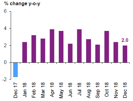 Среднегодовой показатель роста объемов промышленного производства в декабре составил 2.0%, а в ноябре — 2.4%.