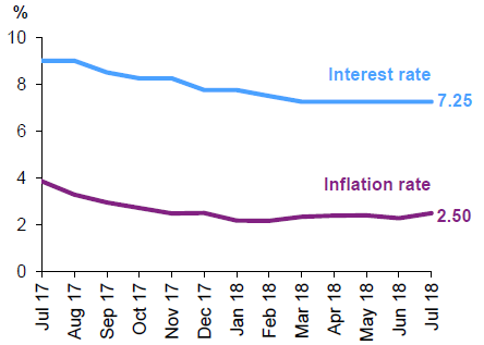 Рубль в июле продолжил стабилизироваться, благодаря чему риск скачка инфляции снизился. Однако, неоднозначная ситуация в частном секторе усилила сомнения по поводу существенного увеличения показателей роста экономики в оставшиеся месяцы 2018 года.