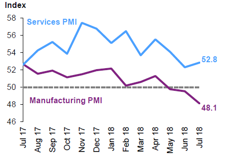 Активность в промышленной отрасли в июле продолжила сокращаться, что отразилось на индексе IHS Markit Manufacturing PMI. В июле индекс составил 48.1, а в июне 49.5. Этому способствовало сокращение объемов производства.