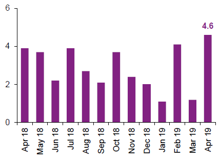 В апреле промышленное производство на 4.6% превысило уровень предшествующего года, а в марте — на 1.2%.