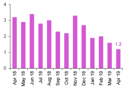 Розничная торговля в апреле расширилась на 1.2% по сравнению с предшествующим годом, а в марте — на 1.6%.