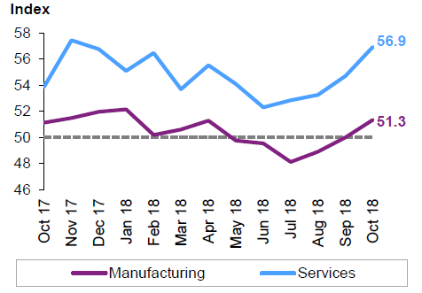В октябре условия в производственной сфере улучшились впервые с апреля. Индекс IHS Markit Manufacturing PMI в октябре составил 51.3, а в сентябре — 50.0.