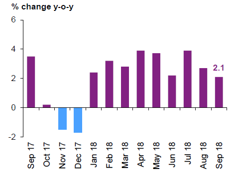 Рост объемов промышленного производства в сентябре составил 2.1%, а в августе — 2.7%.