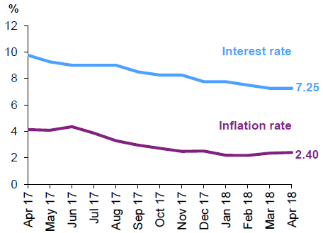 Рис. 1 Соотношение инфляции и уровня процентной ставки в России