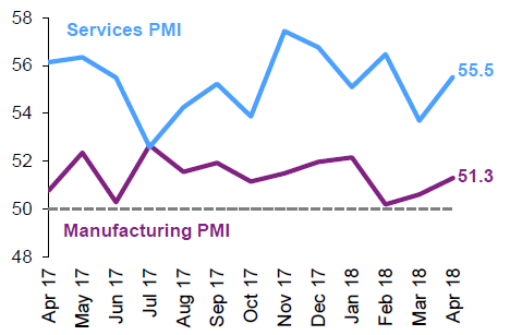 Индекс IHS Markit PMI в апреле увеличился второй месяц подряд и достиг максимального за три месяца значения. В апреле индекс составил 51.3, а в марте – 50.6.