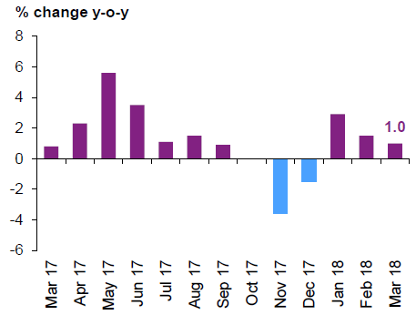 В марте уровень промышленного производства превысил прошлогодний показатель на 1.0%, а в феврале – на 1.5%.