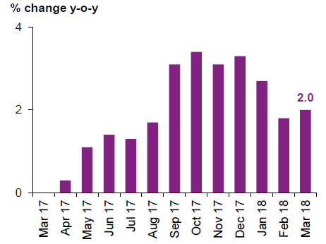 В марте объем розничных продаж увеличился одиннадцатый месяц подряд. По сравнению с прошлым годом, рост данного показателя в марте составил 2.0%, в феврале 1.85%, в январе 2.7% соответственно.