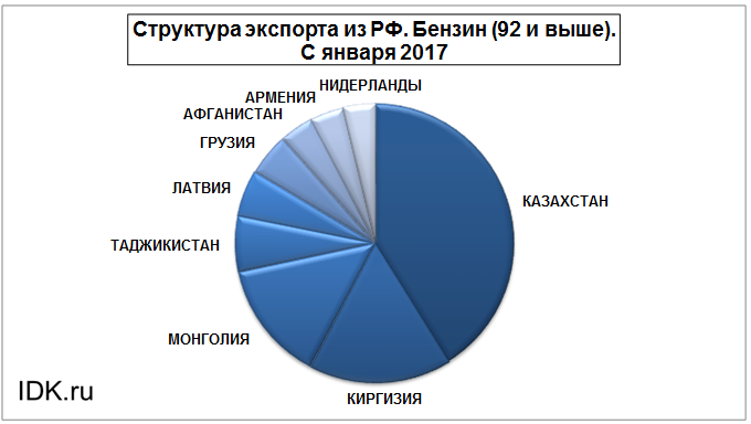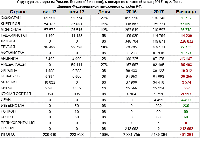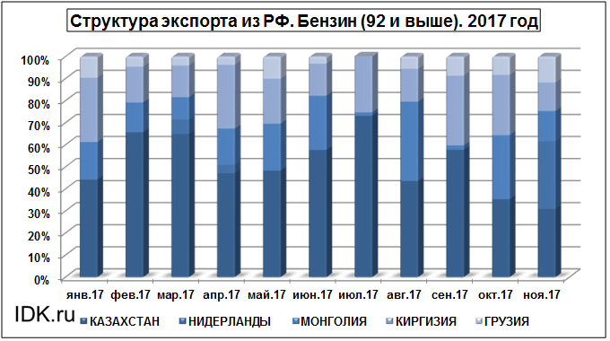 Объем поставок автомобильного бензина с октановым числом 92 или более на экспорт за период с января 2017 года по ноябрь 2017 года в Казахстан составил 916 тыс. тонн., что на 21 тыс. тонн больше объема поставок в данную страну в прошлом 2016 году.