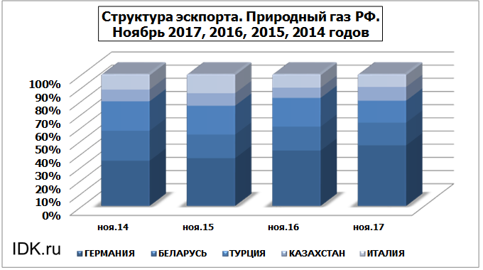 В ноябре 2017 года общий объем экспорта составил: 18.57 млрд. куб. м. Наибольший объем в размере 5.05 млрд. куб. м. был отгружен в Германию.