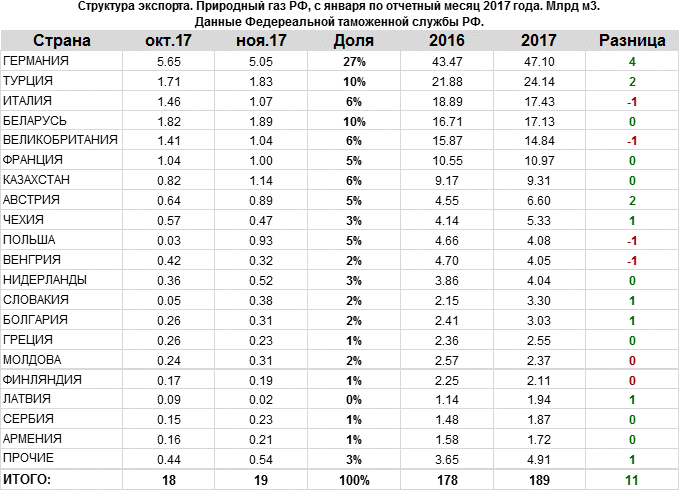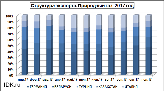 Объем поставок природного газа на экспорт за период с января 2017 года по ноябрь 2017 года в Германию составил 47.1 млрд. куб. м.,что на 3.64 млрд. куб. м. больше объема поставок в данную страну в прошлом сезоне на тот же отчетный месяц.