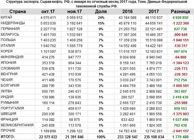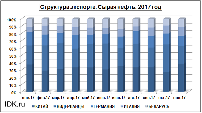 Экспорт сырой нефти из России с января по ноябрь 2017
