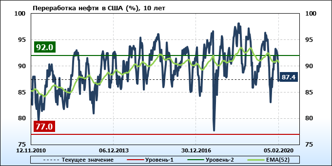 Добыча нефти упала на -0.1 до 12.9 млн. баррелей в день. Импорт нефти упал на -0.045 до 6.615 млн. баррелей в день. Экспорт нефти упал на -0.096 до 3.413 млн. баррелей в день. Таким образом, чистый импорт нефти вырос на 0.051 до 3.202 млн. баррелей в день. Переработка нефти выросла на 0.2 до 87.4 процента.