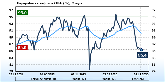 Добыча нефти не изменилась и составляет 13.2 млн. баррелей в день. Импорт нефти вырос на 0.412 до 6.425 млн. баррелей в день. Экспорт нефти вырос на 0.064 до 4.897 млн. баррелей в день. Таким образом, чистый импорт нефти вырос на 0.348 до 1.528 млн. баррелей в день. Переработка нефти упала на -0.2 до 85.4 процента.