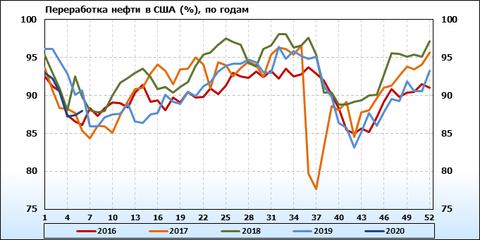 Добыча нефти выросла на 0.1 до 13 млн. баррелей в день. Импорт нефти вырос на 0.363 до 6.978 млн. баррелей в день. Экспорт нефти упал на -0.443 до 2.97 млн. баррелей в день. Таким образом, чистый импорт нефти вырос на 0.806 до 4.008 млн. баррелей в день. Переработка нефти выросла на 0.6 до 88 процента.