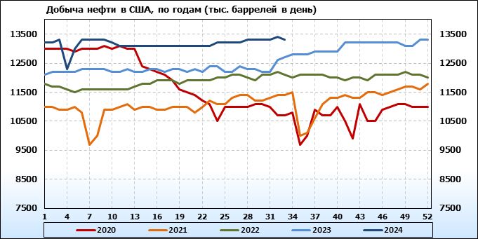 Добыча нефти в США за неделю, завершившуюся 9 августа, снизилась на 100 тысяч баррелей в сутки — до 13,3 миллиона баррелей в сутки, следует из еженедельного обзора управления энергетической информации Минэнерго страны.