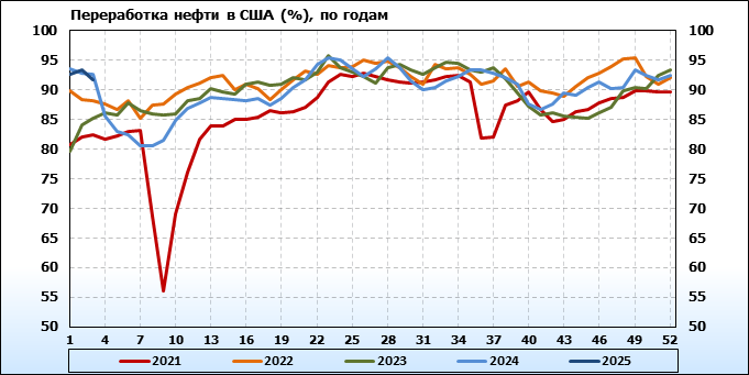Добыча нефти упала на -0.082 до 13.481 млн. баррелей в день. Импорт нефти упал на -0.304 до 6.124 млн. баррелей в день. Экспорт нефти вырос на 1 до 4.078 млн. баррелей в день. Таким образом, чистый импорт нефти упал на -1.304 до 2.046 млн. баррелей в день. Переработка нефти упала на -1.6 до 91.7 процента.