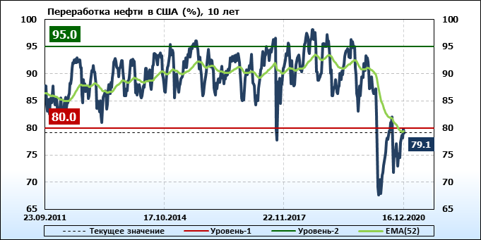 Добыча нефти упала на -0.1 до 11 млн. баррелей в день. Импорт нефти упал на -1.055 до 5.424 млн. баррелей в день. Экспорт нефти вырос на 0.793 до 2.627 млн. баррелей в день. Таким образом, чистый импорт нефти упал на -1.848 до 2.797 млн. баррелей в день. Переработка нефти упала на -0.8 до 79.1 процента.