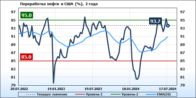 Добыча нефти не изменилась и составляет 13.3 млн. баррелей в день. Импорт нефти вырос на 0.277 до 7.037 млн. баррелей в день. Экспорт нефти упал на -0.035 до 3.964 млн. баррелей в день. Таким образом, чистый импорт нефти вырос на 0.312 до 3.073 млн. баррелей в день. Переработка нефти упала на -1.7 до 93.7 процента.