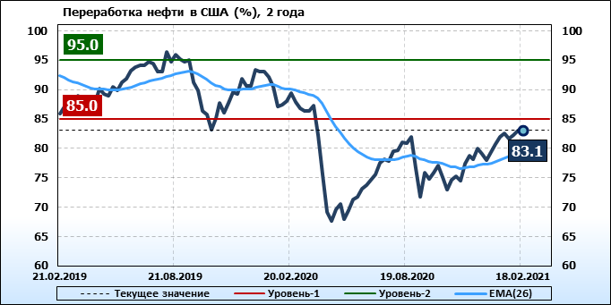 Добыча нефти упала на -0.2 до 10.8 млн. баррелей в день. Импорт нефти вырос на 0.041 до 5.898 млн. баррелей в день. Экспорт нефти вырос на 1.245 до 3.862 млн. баррелей в день. Таким образом, чистый импорт нефти упал на -1.204 до 2.036 млн. баррелей в день. Переработка нефти выросла на 0.1 до 83.1 процента.