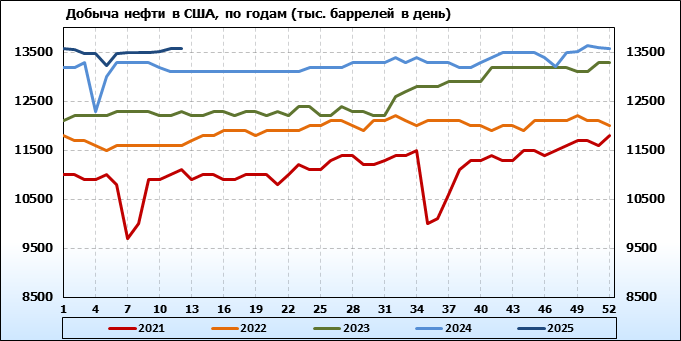 В среднем за последние четыре недели добыча нефти в США составила 13,54 миллиона баррелей в сутки, также говорится в обзоре.