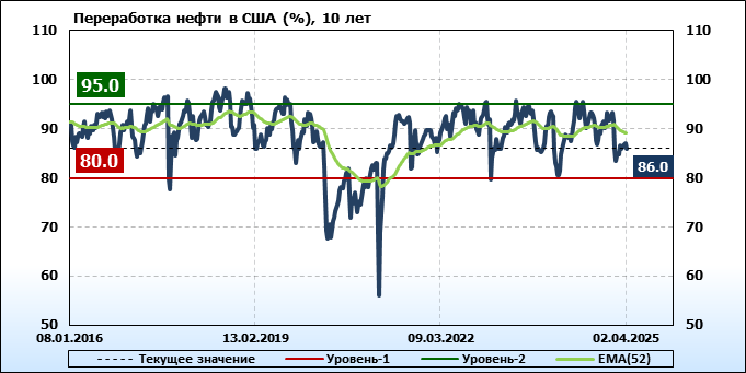 Добыча нефти выросла на 0.006 до 13.58 млн. баррелей в день. Импорт нефти вырос на 0.271 до 6.466 млн. баррелей в день. Экспорт нефти упал на -0.728 до 3.881 млн. баррелей в день. Таким образом, чистый импорт нефти вырос на 0.999 до 2.585 млн. баррелей в день. Переработка нефти упала на -1 до 86 процента.
