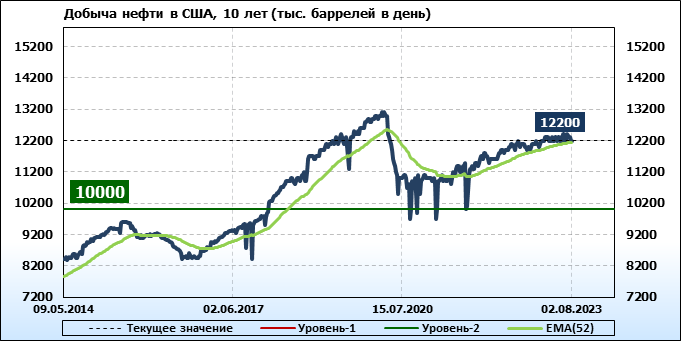 Добыча нефти в США за неделю, завершившуюся 28 июля, сохранилась на уровне предыдущей недели в 12,2 миллиона баррелей в сутки, говорится в еженедельном обзоре управления энергетической информации минэнерго страны.