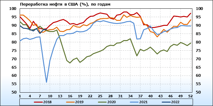 Добыча нефти не изменилась и составляет 11.6 млн. баррелей в день. Импорт нефти упал на -1.061 до 5.767 млн. баррелей в день. Экспорт нефти вырос на 1.11 до 3.796 млн. баррелей в день. Таким образом, чистый импорт нефти упал на -2.171 до 1.971 млн. баррелей в день. Переработка нефти выросла на 0.3 до 87.7 процента.