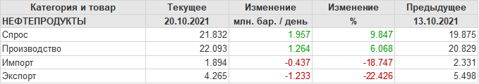 Спрос на нефтепродукты вырос на 1.957 до 21.832 млн. баррелей. Производство нефтепродуктов выросло на 1.264 до 22.093328 млн. баррелей. Импорт нефтепродуктов упал на -0.437 до 1.894 млн. баррелей. Экспорт нефтепродуктов упал на -1.233 до 4.265 млн. баррелей в день.