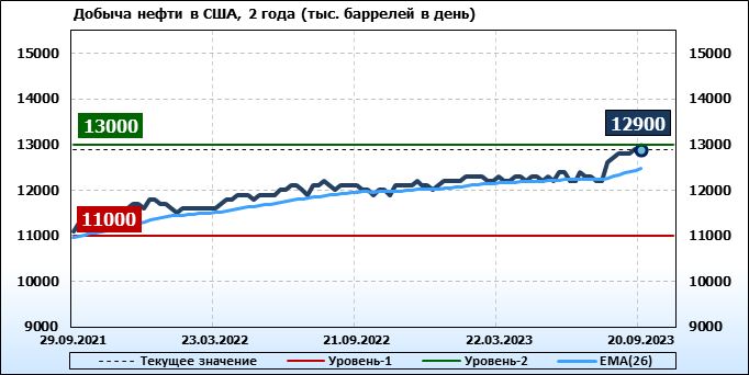 По прогнозам экспертов Energy Intelligence, средний уровень добычи нефти в США в 2023 г. составит рекордные 12,8 млн барр. в сутки, а в 2026 г. достигнет пика в 13,5 млн барр. в сутки.