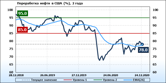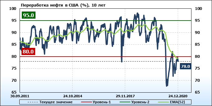 Добыча нефти не изменилась и составляет 11 млн. баррелей в день. Импорт нефти упал на -1.055 до 5.424 млн. баррелей в день. Экспорт нефти вырос на 0.472 до 3.099 млн. баррелей в день. Таким образом, чистый импорт нефти упал на -0.332 до 2.465 млн. баррелей в день. Переработка нефти упала на -1.1 до 78 процента.