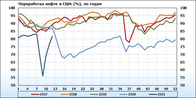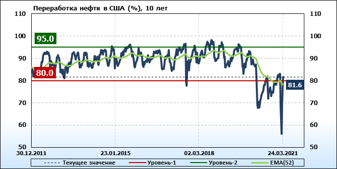 Добыча нефти выросла на 0.1 до 11 млн. баррелей в день. Импорт нефти вырос на 0.299 до 5.622 млн. баррелей в день. Экспорт нефти упал на -0.039 до 2.481 млн. баррелей в день. Таким образом, чистый импорт нефти вырос на 0.338 до 3.141 млн. баррелей в день. Переработка нефти выросла на 5.5 до 81.6 процента.