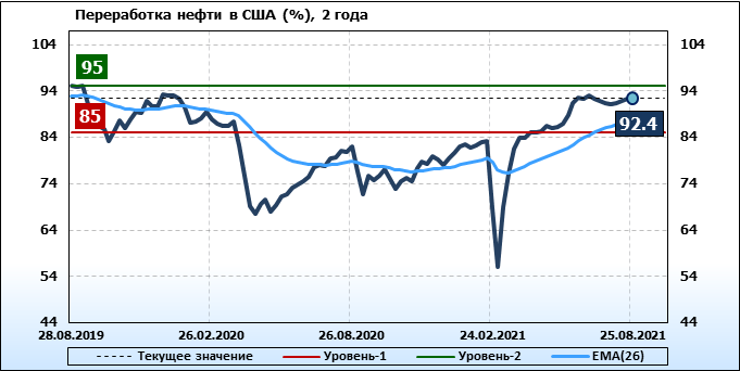 Добыча нефти не изменилась и составляет 11.4 млн. баррелей в день. Импорт нефти упал на -0.193 до 6.157 млн. баррелей в день. Экспорт нефти упал на -0.619 до 2.812 млн. баррелей в день. Таким образом, чистый импорт нефти вырос на 0.426 до 3.345 млн. баррелей в день. Переработка нефти выросла на 0.2 до 92.4 процента.