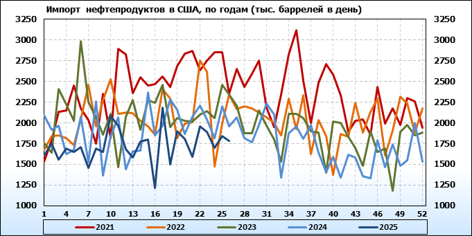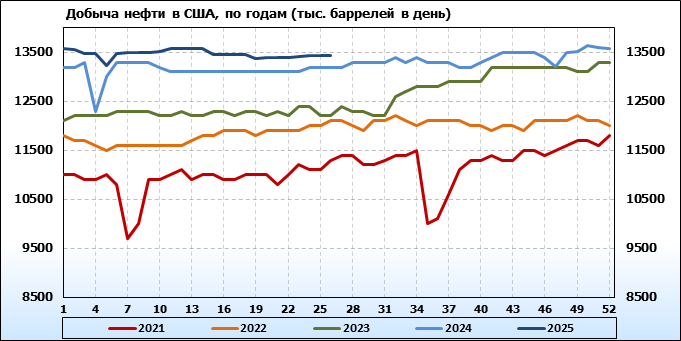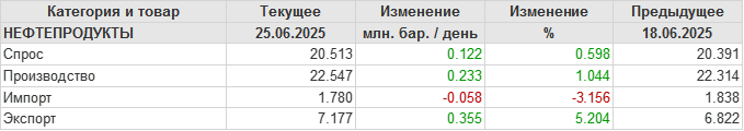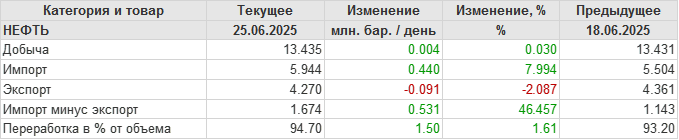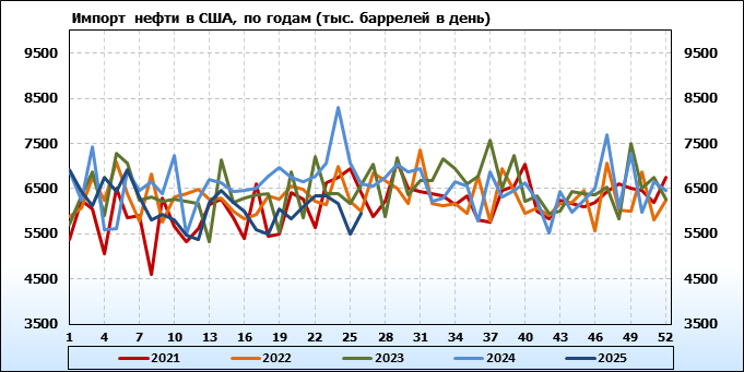 EIA. Добыча, импорт, экспорт нефти в США на 25 июня 2025