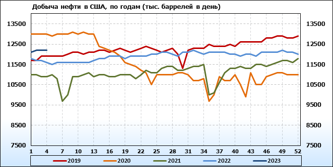Точные данные о добыче управление сообщает в ежемесячном отчете с разницей в два месяца. По окончательным данным, добыча нефти в США в октябре составила 12,38 миллиона баррелей в сутки. По предварительным данным, в ноябре добыча составила также 12,38 миллиона баррелей, в декабре — 11,92 миллиона баррелей, а за весь прошлый год — в среднем 11,86 миллиона баррелей в сутки.