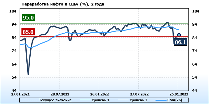 Добыча нефти не изменилась и составляет 12.2 млн. баррелей в день. Импорт нефти упал на -0.956 до 5.905 млн. баррелей в день. Экспорт нефти вырос на 0.835 до 4.707 млн. баррелей в день. Таким образом, чистый импорт нефти упал на -1.791 до 1.198 млн. баррелей в день. Переработка нефти выросла на 0.8 до 86.1 процента.