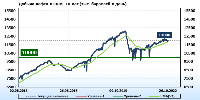 Добыча нефти в США за неделю, завершившуюся 21 октября, сохранилась на уровне 12 миллионов баррелей в сутки, говорится в еженедельном обзоре управления энергетической информации минэнерго страны.