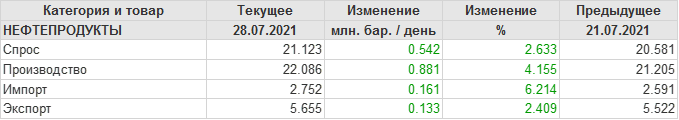 Спрос на нефтепродукты вырос на 0.542 до 21.123 млн. баррелей. Производство нефтепродуктов выросло на 0.881 до 22.086 млн. баррелей. Импорт нефтепродуктов вырос на 0.161 до 2.752 млн. баррелей. Экспорт нефтепродуктов вырос на 0.133 до 5.655 млн. баррелей в день.
