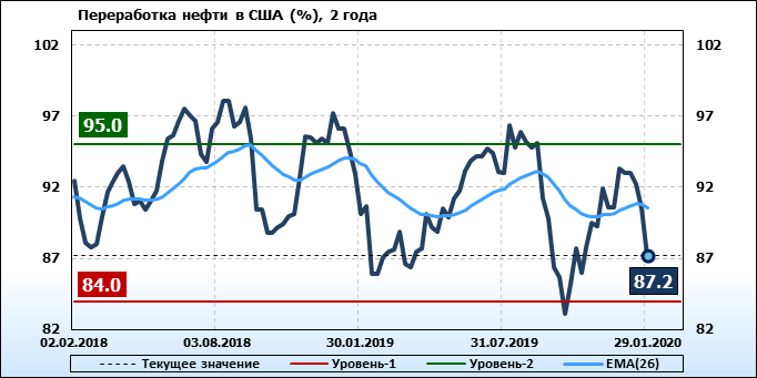 Добыча нефти не изменилась и составляет 13 млн. баррелей в день. Импорт нефти вырос на 0.228 до 6.66 млн. баррелей в день. Экспорт нефти вырос на 0.095 до 3.509 млн. баррелей в день. Таким образом, чистый импорт нефти вырос на 0.133 до 3.151 млн. баррелей в день. Переработка нефти упала на -3.3 до 87.2 процента.