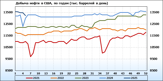 В среднем за последние четыре недели добыча нефти в США составила 13,44 миллиона баррелей в сутки, также говорится в обзоре.