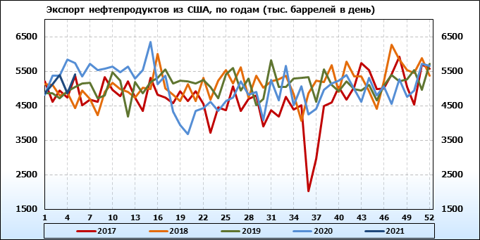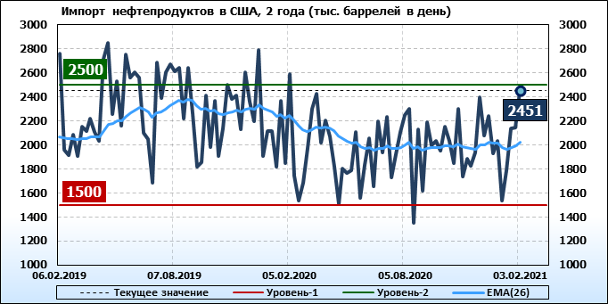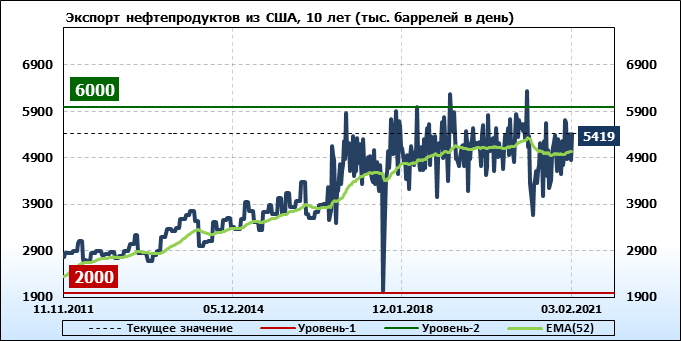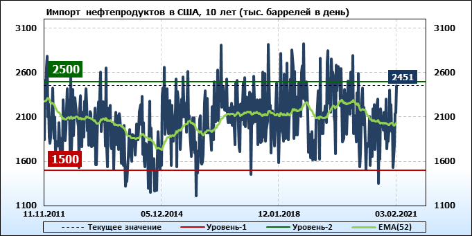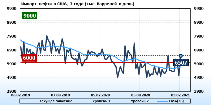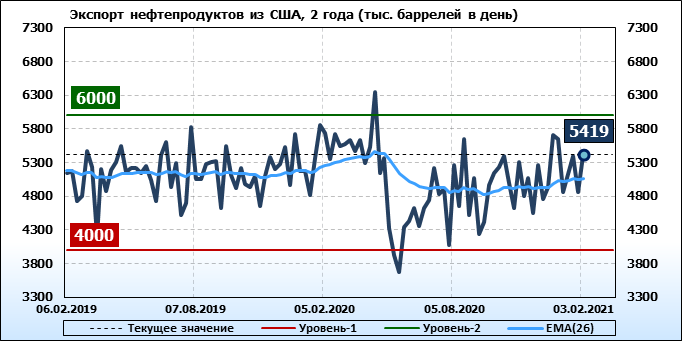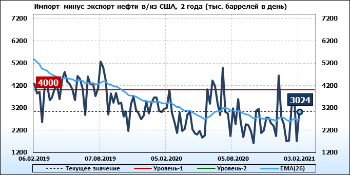 Сегодня, 3 февраля 2021 года, Минэнерго США сообщило, что на неделе 23-29 января текущего года импорт сырой нефти в США вырос на 1,443 млн. баррелей в сутки — до 6,507 млн. баррелей в сутки, а экспорт из страны увеличился на 0,128 млн. баррелей в сутки до 3,483 млн. баррелей в сутки. В результате чистый импорт нефти в США вырос на 1,315 млн. баррелей в сутки — до 3,024 млн. баррелей в сутки. Импорт нефтепродуктов, по данным EIA, вырос на 0,305 млн. баррелей в сутки — до 2,451 млн. баррелей в сутки, а экспорт — на 0,560 млн. баррелей в сутки — до 5,419 млн. баррелей в сутки. Таким образом, ежесуточный нетто-экспорт нефтепродуктов из США вырос на 0,255 млн. баррелей — до 2,968 млн. баррелей. В результате суммарный баланс поставок сырой нефти и нефтепродуктов вновь стал положительным для США, увеличившись на 1,059 млн. баррелей — до 0,056 млн. баррелей. Неделей ранее нетто-экспорт нефти и нефтепродуктов из США составил 1,003 млн. баррелей в сутки.